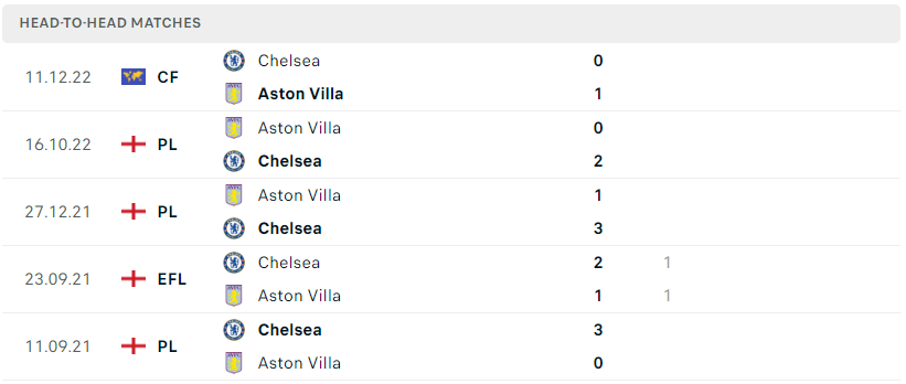 Thành tích đối đầu của Chelsea vs Aston Villa