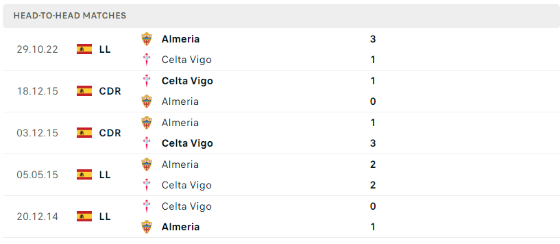 Thành tích đối đầu của Celta Vigo vs Almeria