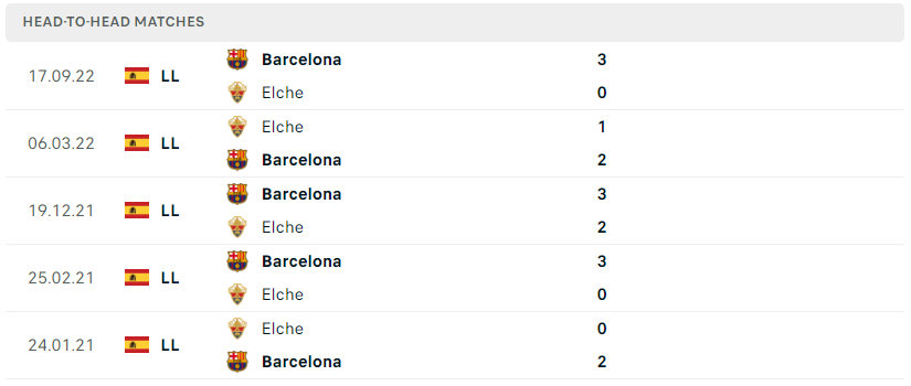 Thành tích đối đầu của Elche vs Barcelona