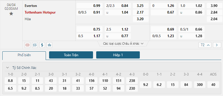 Kèo châu Âu cũng đang là sự ưu thế nhỏ cho các vị khách khi mức ăn của Tottenham đang là 2.17 trong khi đó con số này của Everton đã là 3.25. Rõ ràng việc đối thủ đang chưa thể tìm thấy những vấn đề đang tồn đọng trong lối chơi sẽ là một cơ hội tốt để Everton có thể khai thác hòng mở ra những cơ hội để tạo nên những bất ngờ nhất định. Một thế trận có sự chuẩn bị tốt trên mọi phương diện và cơ hội để có một kết quả khả quan vẫn là rất sáng của đối với nửa xanh vùng Merseyside trước Tottenham.