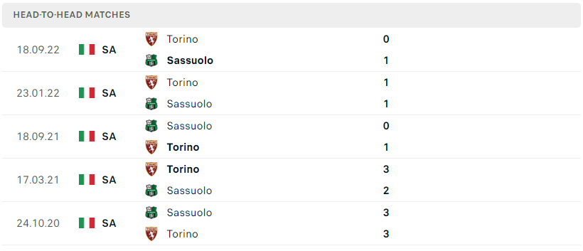 Thành tích đối đầu của Sassuolo vs Torino