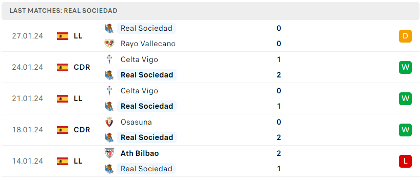 Phía bên kia, dù đã tiến vào đến bán kết cup Nhà vua nhưng nhìn chung màn trình diễn của Real Sociedad tại La Liga là chưa thật sự thuyết phục. Trong 6 vòng đấu gần nhất thì binh đoàn áo xanh sọc trắng cũng chỉ mới mang về duy nhất 1 thắng lợi. Dẫu biết rằng, việc phải chia sức cho nhiều mặt trận đang làm “hao binh tổn tướng”, nhưng việc liên tiếp thi đấu bất ổn tại giải quốc nội chắc chắn sẽ là một tín hiệu bất ổn.