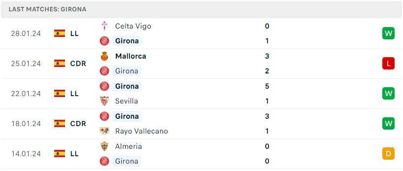 Trận thua đáng tiếc trước Mallorca tại cup Nhà vua có lẽ đã không làm ảnh hưởng nhiều đến sự tự tin của Girona và bằng chứng là việc họ đã nhanh chóng tìm lại mạch thắng sau khi hạ bệ Celta Vigo ít ngày trước. Hiện “chú ngựa ô” đang sở hữu 55 điểm sau 22 vòng đấu và cũng chỉ kém ngôi đầu bảng của Real Madrid đúng 2 điểm. Một sự thăng hoa đến mất kiểm soát vẫn đang hiện hữu trong lối chơi của Girona và nếu cứ thi đấu với phong độ này thì mục tiêu cạnh tranh chức vô địch là hoàn toàn khả dĩ.