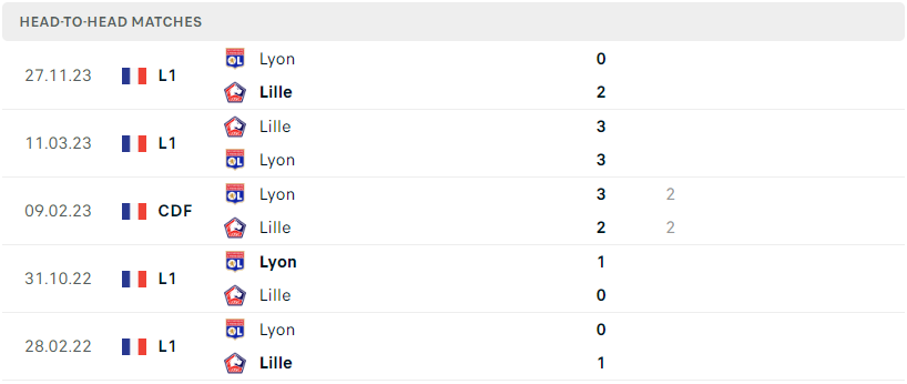 Thành tích đối đầu của Lyon vs Lille