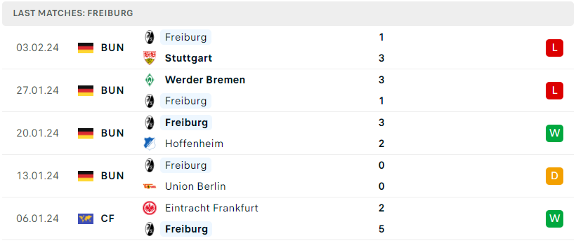 Phía bên kia, Freiburg lại đang trình diễn một phong độ tệ hại trong năm mới và bằng chứng là việc họ cũng chỉ mới thắng 1/4 vòng đấu gần nhất tại Bundesliga. Chưa kể, trong 2 thất bại mới nhất trước Stuttgart và Werder Bremen thì tập thể này đã phải nhận về đến 6 bàn thua. Dù được đánh giá là một ẩn số đầy tiềm năng trong những mùa giải gần đây, nhưng sự ổn định luôn là thứ mà Freiburg không thể có được. Chính vì thế, nếu muốn nghĩ về một tấm vé dự cup Châu Âu thì họ buộc phải sớm lấy lại sự tự tin.