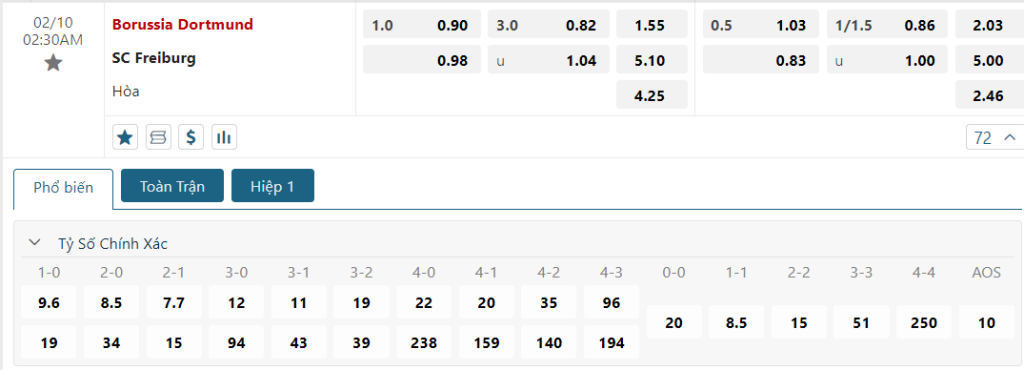 Kèo Châu Âu vẫn đang là sự ưu thế dành cho Dortmund, khi mức ăn của họ đang là 1.55 trong khi con số này của các vị khách là 5.10. Trận hòa tương đối thất vọng trước Heidenheim ở vòng đấu trước rõ ràng là một cú sốc lớn dành cho Dortmund vào lúc này, do đó với quyết tâm bứt phá thì đoàn quân Edin Terzic sẽ thi đấu với tối đa động lực. Sự thua thiệt về nhiều mặt sẽ khiến Freiburg tiếp tục phải nhận thất bại.