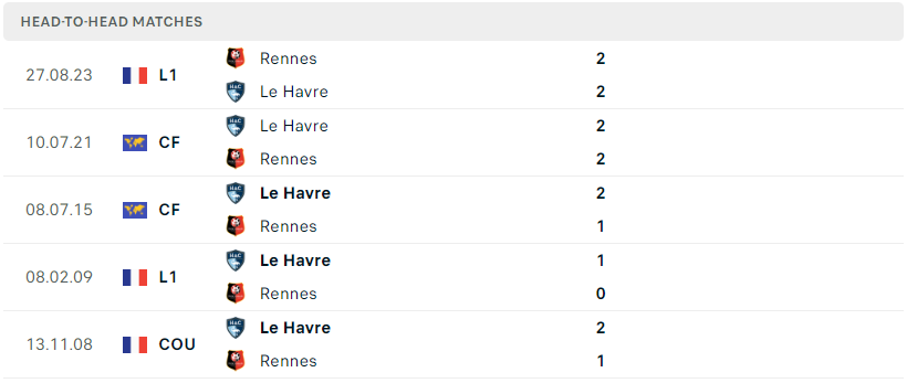 Thành tích đối đầu của Le Havre vs Rennes