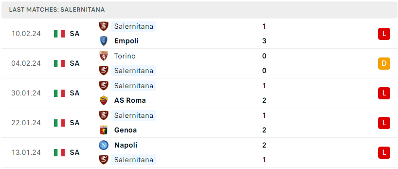 Trong khi đó, Salernitana lại đang thi đấu với một phong độ hoàn toàn trái ngược khi họ đã để thua đến 15 trận đấu kể từ đầu mùa và hiện cũng chỉ sở hữu 13 điểm trong tay. Thành tích tệ hại này đang khiến tập thể vùng Campania có nguy cơ rất lớn phải đối mặt với việc xuống hạng mùa sau. Cách biệt giữa họ và nhóm an toàn đã lên đến 6 điểm và nếu không có nhiều sự chấn chỉnh trong giai đoạn lượt về thì một tấm vé trở lại Serie B có lẽ cũng chỉ còn là câu chuyện thời gian.