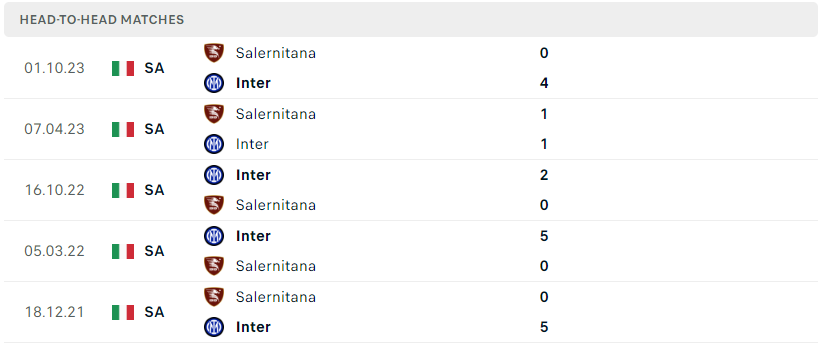 Thành tích đối đầu của Inter vs Salernitana