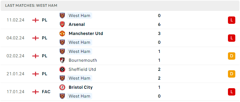 Phía bên kia, một cái tên khác cũng đang sa sút đến mức mất kiểm soát là West Ham, thống kê cho thấy kể từ đầu năm 2024 tập thể Tây London đã toàn hòa và thua trong cả 7 lần ra sân mới nhất. Đáng nói, trong 2 thất bại mới nhất của Búa Tạ thì họ đã nhận về đến 9 bàn thua và chưa mang về bất kỳ bàn thắng nào. Từng được đánh giá là “chú ngựa ô” sẵn sàng bứt phá top 4 nhưng càng thi đấu West Ham càng lộ ra nhiều vấn đề. Chạm trán Nottingham sẽ là cơ hội tốt để họ trở lại.