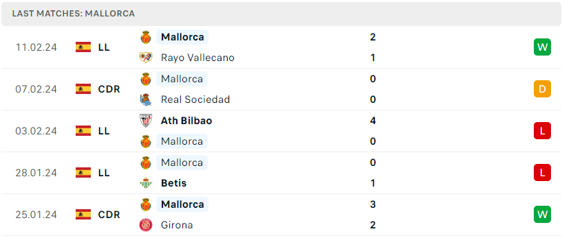 Như vậy là chuỗi 5 trận liên tiếp không nếm mùi chiến thắng của Mallorca cũng vừa bị đứt mạch khi họ vừa đánh bại Rayo Vallecano ở vòng đấu gần nhất. Thắng lợi này đã giúp đoàn quân Javier Aguirre chính thức thoát ra khỏi nhóm xuống hạng và hiện đang nắm giữ cách biệt điểm số là 6 điểm. Việc đã tiến vào đến bán kết cup Nhà vua rõ ràng là một tín hiệu đầy khởi sắc và màn tái đấu chính đối thủ thuộc vòng 25 La Liga tới đây vẫn được dự báo là một thách thức không dễ dành cho đội bóng đảo Baleares.
