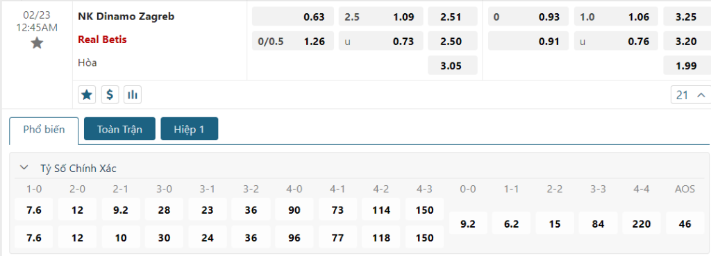 Kèo Châu Âu vẫn đang là sự nhỉnh hơn đôi chút dành cho Betis, khi mức ăn của họ là 2.50 trong khi con số này của Zagreb là 2.51. Dù không quá nhiều nhưng nó đủ để thấy đôi phần sự lấn lướt về trình độ của bầy Chim Xanh so với đối thủ. Trong một tình cảnh không còn gì để mất thì chắc chắn đoàn quân Pellegrini sẽ có những đối sách nhằm quay trở lại. Những sự tự tin có được sẽ giúp họ đánh bại Zagreb và lách qua khe cửa hẹp.