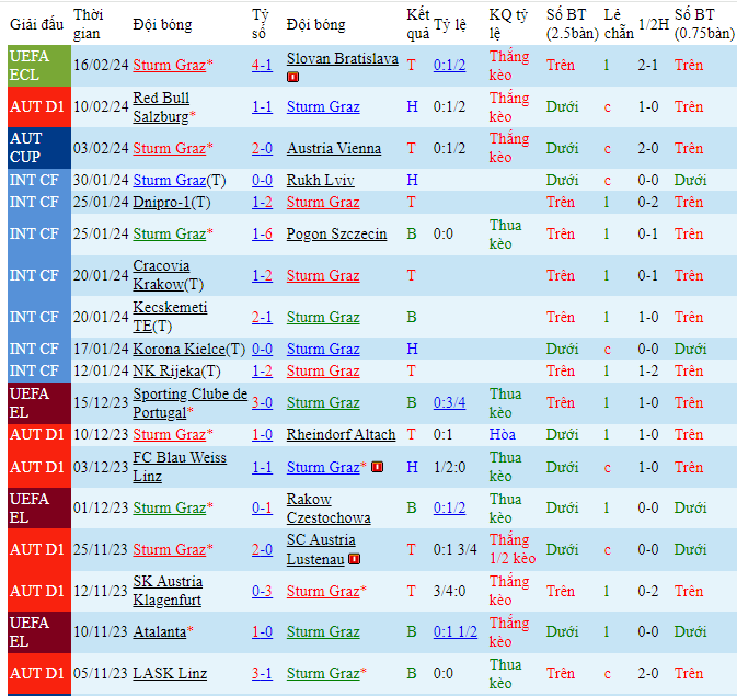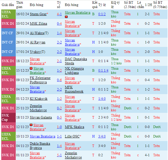 Bảng tỷ lệ kèo bóng đá trận đấu Slovan Bratislava vs Sturm Graz