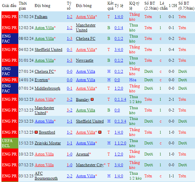 Bảng tỷ lệ kèo bóng đá trận đấu Aston Villa vs Nottingham Forest