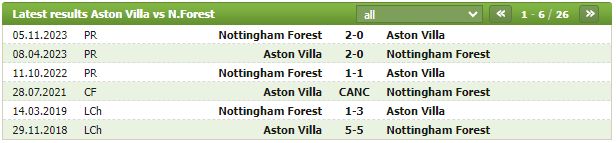 Lịch sử thi đấu của Aston Villa vs Nottingham Forest