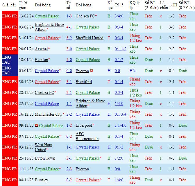 Lịch sử thi đấu của Crystal Palace vs Burnley