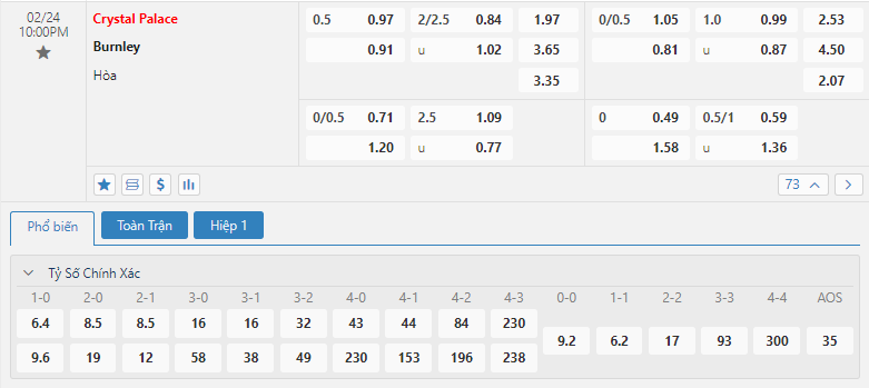 Kèo châu Âu cũng đang là sự ưu thế cho đội chủ nhà khi mức ăn của Crystal Palace đang là 1.97 trong khi đó con số này của Burnley đã là 3.65. Một khoảng thời gian vô cùng khó khăn và hơn lúc nào hết Crystal Palace sẽ cần phải có được sự quyết tâm vươn lên cùng với đó là những giải pháp để đưa mình trở lại với guồng quay hiện tại. Các lợi thế đang có sẽ là cơ sở để họ có thể nghĩ đến một chiến thắng trước Burnley ở trận đấu tới.