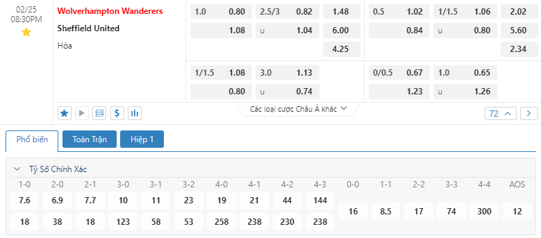 Kèo châu Âu cũng đang là sự ưu thế cho đội chủ nhà khi mức ăn của Wolves đang là 1.48 trong khi đó con số này của Sheffield United đã là 6.00. Một trận đấu mà tương quan về mặt chất lượng nhân sự cùng với đó là màn trình diễn có phần trái ngược nhau sẽ khiến cho cán cân hoàn toàn nghiêng về phía Wolves ở thời điểm này. Nhiều khả năng họ sẽ là đội bóng có được 3 điểm trước Sheffield United trong kèo đấu sắp tới.