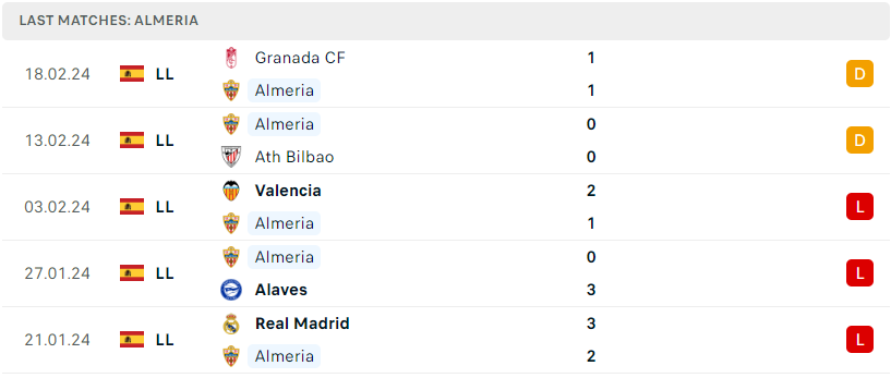 Sự yếu kém vẫn đang tiếp tục được Almeria thể hiện khi tập thể này đang là một trong số ít đội tại Châu Âu vẫn chưa mang về được bất kỳ thắng lợi nào kể từ đầu mùa. Một lối đá rệu rã và gần như chẳng có bất kỳ mối đe dọa nào đang biến tập thể vùng Andalusia trở thành kho điểm đích thực tại La Liga mùa này. Họ hiện chỉ mới mang về 8 điểm sau 25 vòng đấu và cách nhóm an toàn lên đến 12 điểm. Nếu không có quá nhiều sự bứt phá trong thời gian tới, một tấm vé xuống hạng gần như là chắc chắn dành cho họ.
