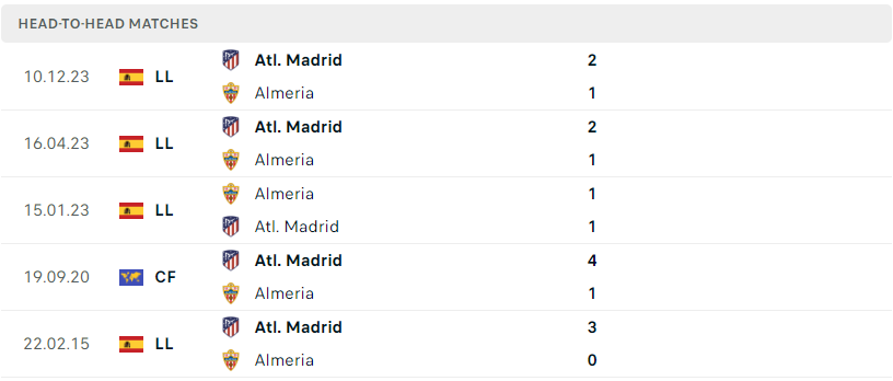 Thành tích đối đầu của Almeria vs Atl. Madrid