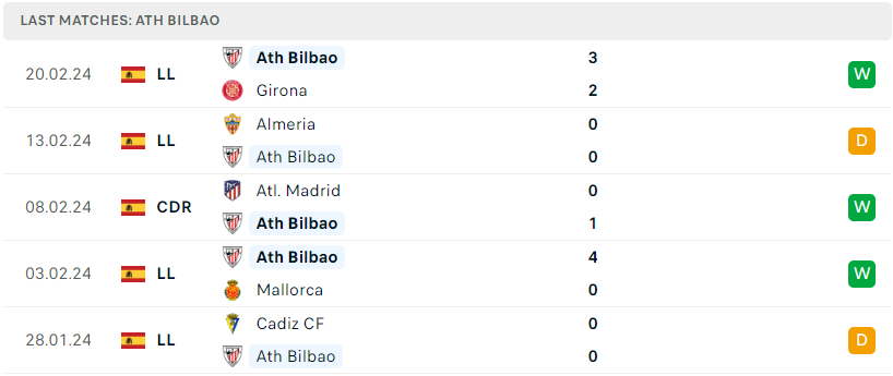 Trong khi đó với Ath Bilbao, tập thể này tiếp tục cho thấy thực lực và sự ổn định đáng sợ của họ bằng thắng lợi 3-2 trước “hiện tượng” Girona ở vòng đấu trước. Trận thắng này đã là trận bất bại thứ 6 liên tiếp của đoàn quân Ernesto Valverde trên mọi mặt trận. Hiện họ cũng chỉ còn kém top 4 đúng 2 điểm và với điểm rơi phong độ chói sáng như hiện tại thì Ath Bilbao hoàn toàn có thể tiếp tục nuôi tham vọng chen chân vào top 4. Dù vậy, nhưng họ cần phải vượt qua thách thức trước mắt là Betis ở vòng đấu kế tiếp.