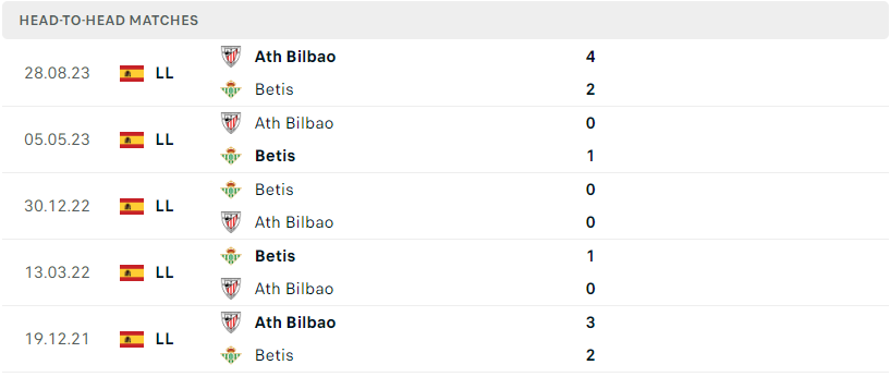 Lịch sử thi đấu giữa hai đội tiếp tục ghi nhận là sự cân bằng khi cả đôi bên cùng mang về 2 chiến thắng và 1 trận hòa trong 5 lần đụng độ gần nhất. Dù biết rằng, với sự hưng phấn ở hiện tại thì Ath Bilbao sẽ không dễ dàng chịu khuất phục trước Betis, tuy nhiên đoàn quân Valverde cũng sẽ chẳng thể gây ra quá nhiều mối đe dọa dành cho đối thủ. Thế trận giằng co và đầy thực dụng sẽ thiết lập nên một tỉ số hòa.