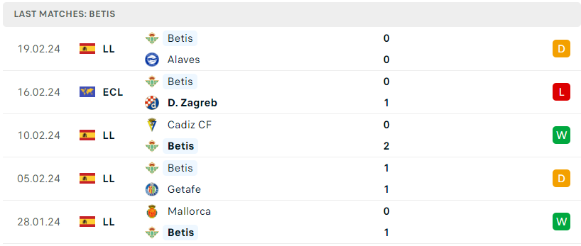 Có vẻ như Real Betis đang bước vào chu kỳ sa sút, khi họ đã toàn hòa và thua trong 2 trận đấu mới nhất. Đáng ngại hơn, cả 2 đối thủ mà họ đụng độ đều không được đánh giá quá cao như D. Zagreb và cả Alaves. Một thời điểm khó khăn và đang phải hứng chịu nhiều sức ép, vì thế đoàn quân Manuel Pellegrini buộc phải có những động thái trở lại trước khi họ đánh mất toàn bộ những lợi thế đã xây dựng được. Màn tiếp đón Ath Bilbao sắp tới được xem là chất xúc tác cần thiết dành cho bầy Chim Xanh vào lúc này.