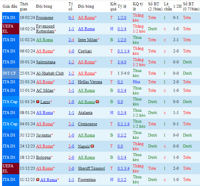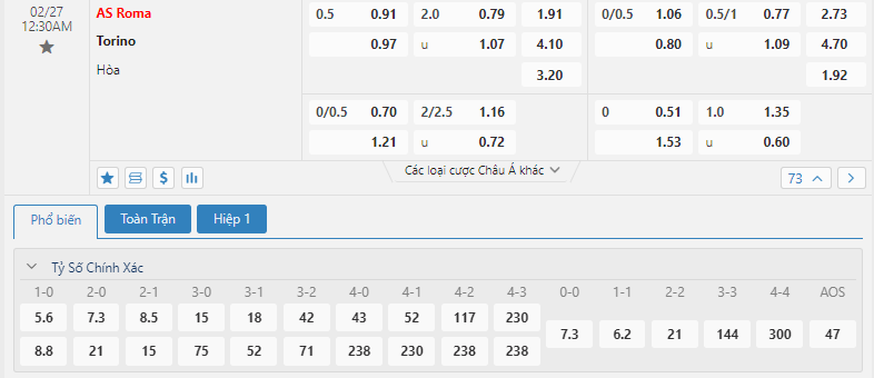 • Chọn AS Roma -0.5 FT
