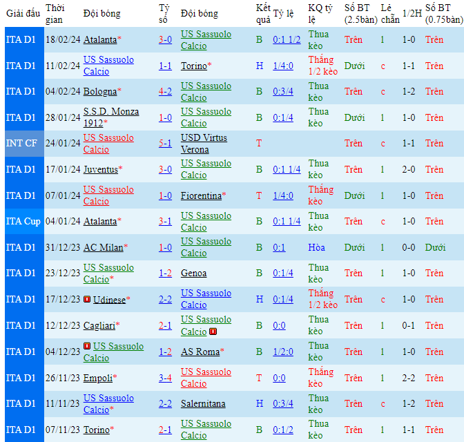 -Phong độ Sassuolo
