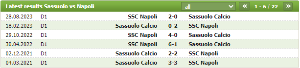 Napoli cũng đã đánh bại Sassuolo với tỉ số 2-0 trên sân nhà của mình ở mùa giải năm nay trong trận đấu lượt đi giữa hai đội. Nhìn chung thì đó cũng là đôi chút hành trang để giúp cho nhà ĐKVĐ có thêm quyết tâm trong chuyến hành quân tới đặc biệt là khi những khó khăn và áp lực đang bủa vây họ. Sassuolo cũng đang ở trong một tình trạng tiến thoái lưỡng nan và nếu như thể hiện đúng sức mạnh của mình thì có lẽ 3 điểm không phải là mục tiêu quá khó đối với Napoli.