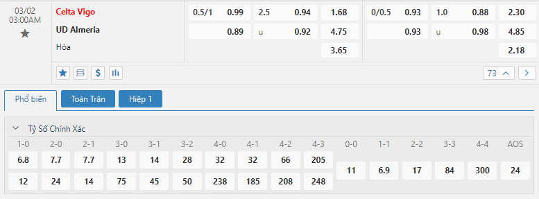 Kèo châu Âu cũng đang là sự ưu thế cho đội chủ nhà khi mức ăn của Celta Vigo đang là 1.68 trong khi đó con số này của Almeria đã là 4.75. Một khoảng thời gian vô cùng khó khăn và hơn lúc nào hết Celta Vigo sẽ cần phải có được sự quyết tâm vươn lên cùng với đó là những giải pháp để đưa mình trở lại với guồng quay hiện tại. Các lợi thế đang có sẽ là cơ sở để họ có thể nghĩ đến một chiến thắng trước Almeria ở trận đấu tới.
