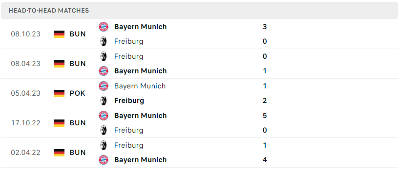 Sự áp đảo một lần nữa được Hùm Xám thể hiện qua thành tích đối đầu, cụ thể họ đã thắng đến 4/5 lần đụng độ gần nhất và trận đấu ở lượt đi đoàn quân Thomas Tuchel cũng đã dễ dàng hủy diệt đối thủ với tỉ số 3-0. Một thời điểm khó khăn và Bayern Munich lại càng có lý do để tái hiện kịch bản trong quá khứ. Chất lượng nhân sự vượt trội sẽ giúp họ hạn chế mọi sự phản kháng của Freiburg.