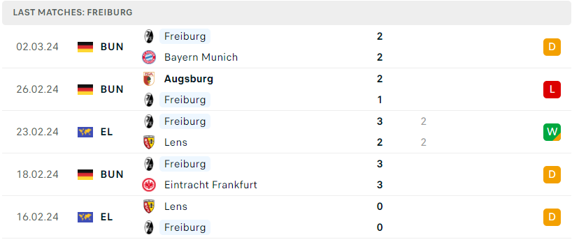 Bên kia chuyến tuyến, Freiburg cũng vừa tạo nên cơn địa chấn khi xuất sắc cầm hòa được Bayern Munich ở vòng đấu trước. Mặc dù vậy, nhưng nhìn chung phong độ của họ tại Bundesliga kể từ đầu tháng 2 là rất đáng báo động. Trong 5 vòng đấu gần nhất thì Freiburg cũng chỉ mang về vỏn vẹn 2 điểm và thầy trò Streich hiện đã bị đẩy xuống top 9 trên BXH. Việc phải gồng mình thi đấu trên 2 mặt trận song song chắc chắn sẽ còn ảnh hưởng đến thành tích của họ tại giải quốc nội.