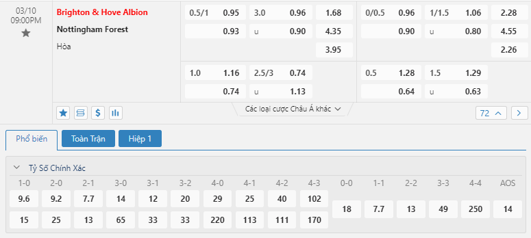 Bảng tỷ lệ kèo bóng đá trận đấu Brighton vs Nottingham Forest