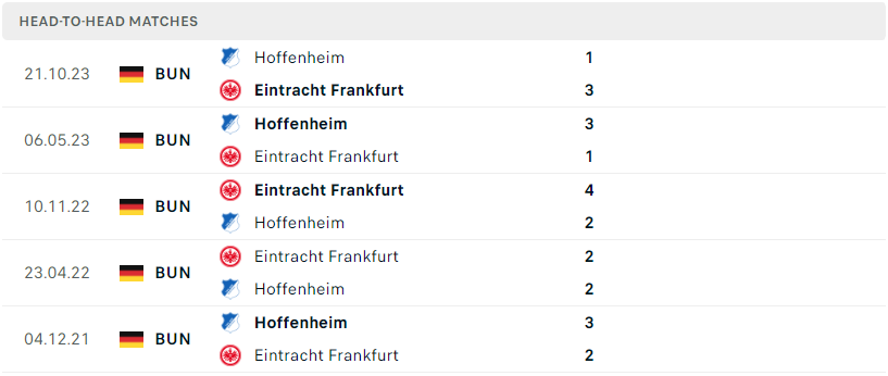 Thành tích đối đầu của Eintracht Frankfurt vs Hoffenheim