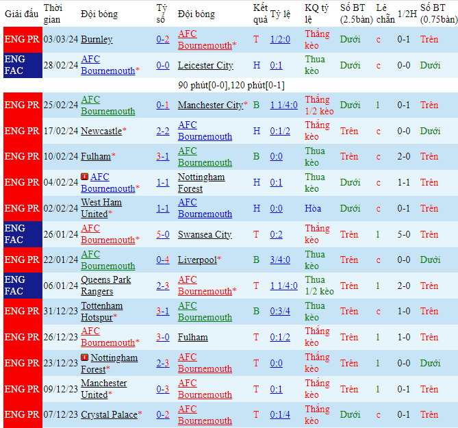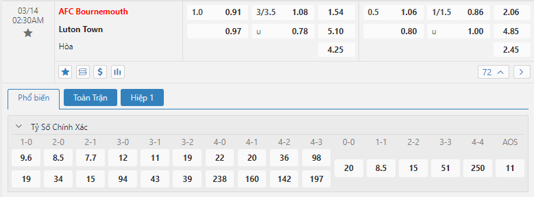 Kèo châu Âu cũng đang là sự ưu thế cho đội chủ nhà khi mức ăn của Bournemouth đang là 1.54 trong khi đó con số này của Luton Town đã là 5.10. Một khoảng thời gian vô cùng khó khăn và hơn lúc nào hết Bournemouth sẽ cần phải có được sự quyết tâm vươn lên cùng với đó là những giải pháp để đưa mình trở lại với guồng quay hiện tại. Các lợi thế đang có sẽ là cơ sở để họ có thể nghĩ đến một chiến thắng trước Luton Town ở trận đấu tới.