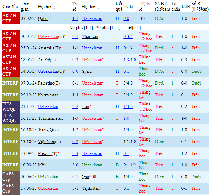 Kèo châu Âu cũng đang là sự ưu thế lớn cho các vị khách Uzbekistan trước Hong Kong trong kèo đấu này. Nhìn chung việc đang áp đảo trên các phương diện đội hình lẫn phong độ thi đấu sẽ tạo ra một đà tâm lý rất tốt để Uzbekistan hoàn toàn có thể làm chủ được trận đấu sắp tới. Sẽ là một kèo đấu mà Uzbekistan được kì vọng sẽ có thể dễ dàng có được 3 điểm trước Hong Kong và mở ra lợi thế cho mình.