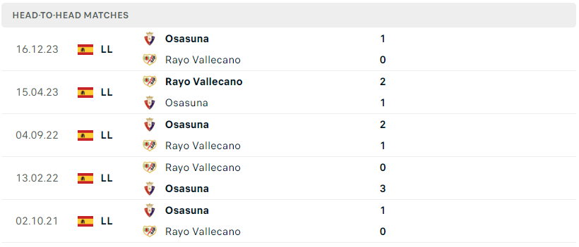 Thành tích đối đầu của Rayo Vallecano vs Osasuna