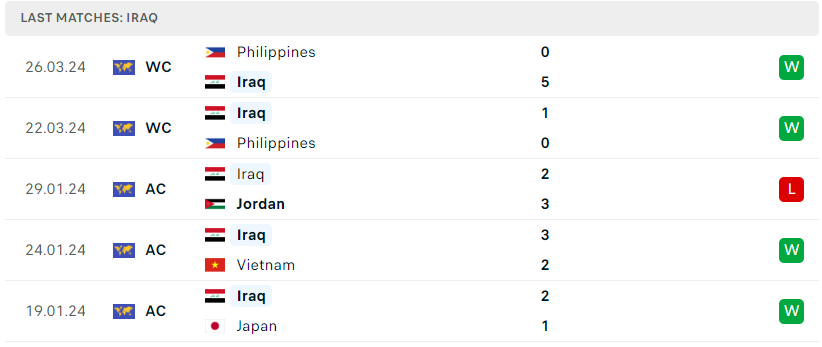 Bên kia chuyến tuyến, Iraq lại thể hiện một sức mạnh khủng khiếp khi họ vẫn đang duy trì thành tích toàn thắng tại F và thậm chí cũng chỉ để lọt lưới duy nhất 1 bàn- sau 4 lượt trận. Sau kỳ Asian Cup không quá thành công trên đất Qatar, đoàn quân Jesús Casas đang đặt đất nhiều sự kỳ vọng trong việc giành lấy tấm vé đến với World Cup 2026, trận thắng 5 sao trước Philippines ở lượt trận trước là một minh chứng. Do đó, 3 điểm vẫn sẽ là ưu tiên hàng đầu của đội tuyển này ở lượt trận hạ màn.