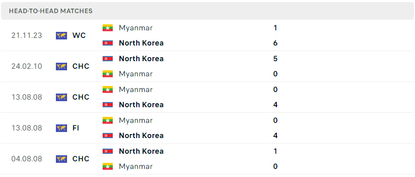 Thành tích đối đầu của Triều Tiên vs Myanmar