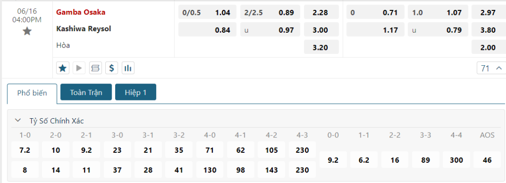 Bảng tỷ lệ kèo bóng đá trận đấu Gamba Osaka vs Kashiwa Reysol