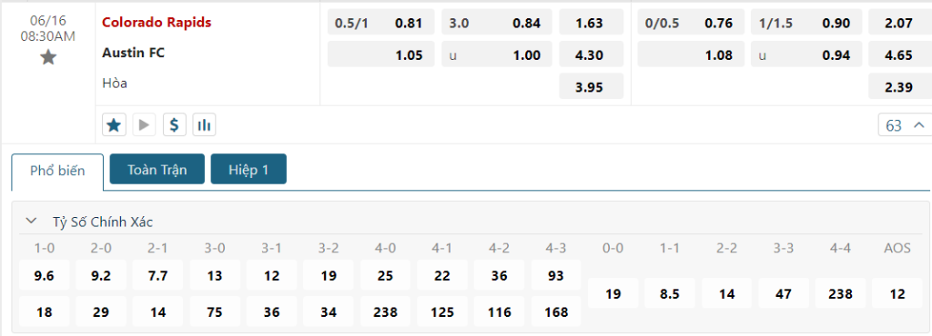 Bảng tỷ lệ kèo bóng đá trận đấu Colorado Rapids vs Austin FC