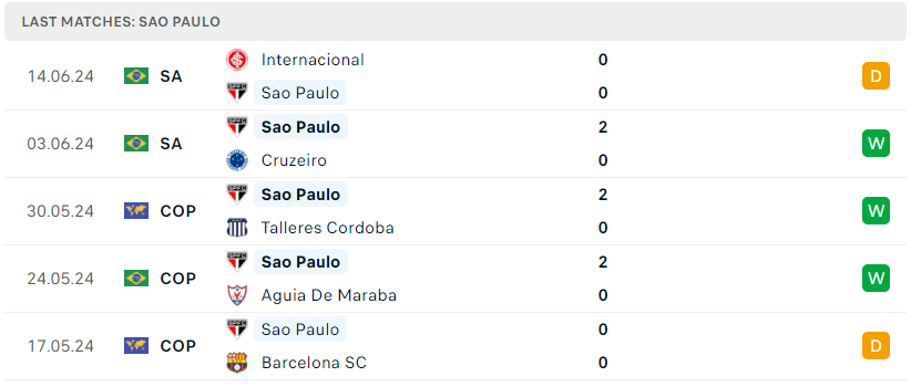 Bên phía đối diện, Sao Paulo lại đang thể hiện bộ mặt trái ngược khi không chỉ thi đấu tốt tại cup quốc gia lẫn đấu trường Copa Libertadores, họ còn chơi cực bay tại Serie A Brazil khi đã mang về đến 6 trận bất bại từ đầu mùa và hiện đang nắm giữ vị trí thứ 5 trên BXH. Trận hòa trước Internacional ít giờ trước đã là trận bất bại thứ 10 liên tiếp của tập thể này. Nếu cứ chơi phong độ thăng hoa như hiện tại, Sao Paulo hoàn toàn có thể tiến xa tại mọi đấu trường mùa này.