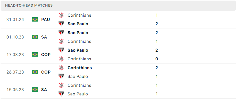 Thành tích đối đầu của Corinthians vs Sao Paulo