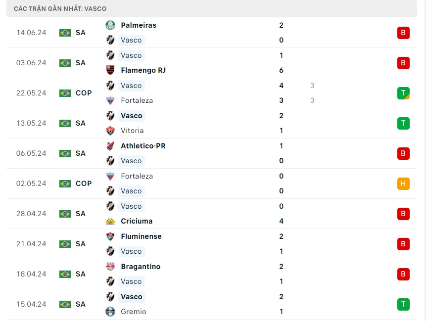 Phong độ đội bóng Vasco vs Cruzeiro