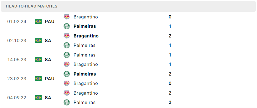 Thành tích đối đầu của Palmeiras vs Bragantino
