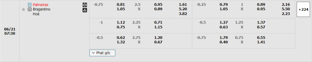 Sân nhà vẫn đang là lợi thế giúp nhà ĐKVĐ nhận được sự ưu ái ở kèo đấu Châu Âu, mức ăn của họ là 1.61 trong khi con số này của Bragantino là 5.20. Có thể thấy, dù Bragantino đang thi đấu khá ấn tượng ở hiện tại nhưng nghiểm nhiên xét về mọi mặt và cửa thắng thì họ vẫn không thể bằng Palmeiras. Những lợi thế có được cùng với sự tự tin sẽ giúp binh đoàn áo xanh tiếp tục nối dài mạch thắng.