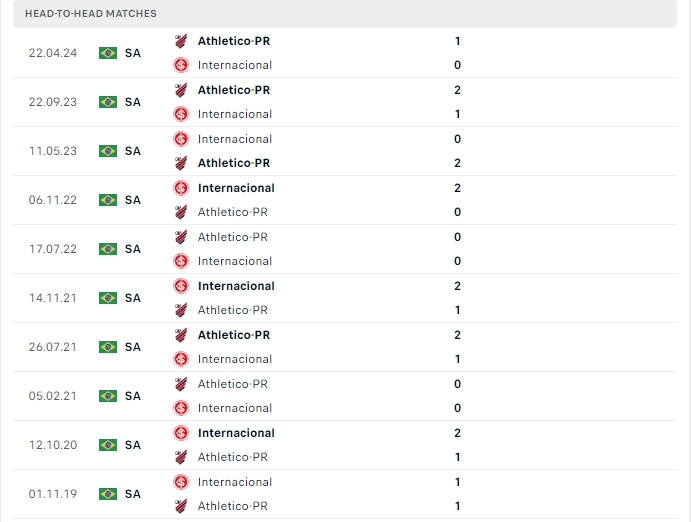 Lịch sử thi đấu của Internacional vs Athletico-PR