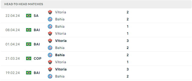 Thành tích đối đầu của Bahia vs Vitoria