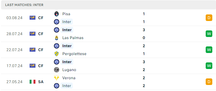 Bên phía kia, Inter Milan có phần khiêm tốn hơn trong số những ông lớn tại Serie A thì Nerazzurri chính là tập thể ít mua sắm nhất vào mùa hè này. Dù vậy, nhưng không vì thế thực lực của đoàn quân Simone Inzaghi có phần giảm sút so với mùa giải trước. Trong 4 trận đấu giao hữu tiền mùa giải thì đại diện Serie A cũng đã thắng 3 và hòa 1. Với một dàn nhân sự trẻ cùng với sự kinh nghiệm và bản lĩnh của các trụ cột, Inter Milan vẫn sẽ là một thế lực tại Serie A mùa giải tới.